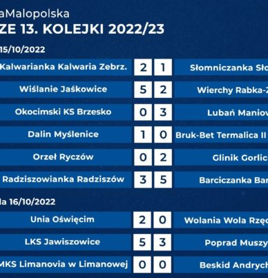 Kolejka nr 13 w JAKO 4 LIDZE MAŁOPOLSKIEJ nie była szczęśliwa dla dotychczasowego lidera – rezerwy Bruk-Betu Termaliki Nieciecza. „Słoni” powstrzymał Dalin. Nowym przodownikiem zostali Wiślanie Jaśkowice, którzy strzelili pięć goli Wierchom. Pierwsze zwycięstwo w sezonie odniosła Kalwarianka. Strzelecka uczta w wydaniu beniaminkówRadziszowianka – Barciczanka 3-5 (2-4)0-1 Ciężobka 80-2 Zygmunt 191-2 Ślaski 221-3 Bonalde 322-3 Kowalówka 382-4 Zawiślan 432-5 Zygmunt 513-5 […]