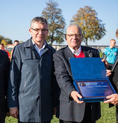 Przed finałowym meczem o Puchar Polski w Podokręgu Nowy Sącz miała miejsce miła uroczystość. Jerzy Leszczyński, wiceprezes Podokręgu, z okazji jubileuszu 60-lecia działalności w sporcie, otrzymał z rąk prezesa Pawła Cieślickiego pamiątkowe grawertony. Prezes Cieślicki odczytał list gratulacyjny w imieniu Zarządu MZPN i Zarządu Podokręgu.W uroczystości uczestniczyli burmistrz Starego Sącza Jacek Lelek i wiceburmistrz Kazimierz Gizicki. Fot. DTS