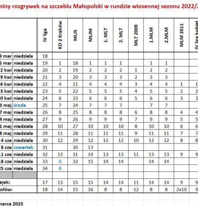 Wydział Gier Małopolskiego Związku Piłki Nożnej przygotował wstępny plan (zatwierdzony 2 stycznia 2023 r.) ligowych kolejek w rundzie wiosennej sezonu 2022/2023. Dotyczy on rozgrywek prowadzonych przez WG MZPN.Najwcześniej, bo 18 marca 2023 r. rozpoczną rundę wiosenną drużyny IV ligi. Tydzień później rozegrane zostaną pierwsze mecze w Klasie Okręgowej 2 Kraków, ligach wojewódzkich juniorów, juniorów młodszych, trampkarzy i młodzików.Klasa Okręgowa 2 Kraków zakończy ligę 10 […]