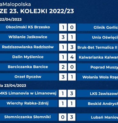 Kalwarianka odniosła czwarte zwycięstwo z rzędu, dzięki czemu pogoń za strefą bezpieczną w JAKO 4 LIDZE MAŁOPOLSKIEJ ma coraz bardziej realne szanse na powodzenie. W rundzie wiosennej drużyna z Kalwarii Zebrzydowskiej zgromadziła już 12 punktów, a ma jeszcze mecz zaległy. Więcej punktów w marcu i kwietniu zgromadziły tylko dwa zespoły: lider Wiślanie Jaśkowice (14) i Orzeł Ryczów (13). JAKO 4 LIGA MAŁOPOLSKA, 23. kolejkaSobota, 22 kwietnia 2023Okocimski KS […]