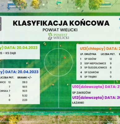 W Podokręgu MZPN Wieliczka odbyły się eliminacje XXIII Turnieju „Z Podwórka na Stadion o Puchar Tymbarku”. Awans do finałów wojewódzkich uzyskali:ChłopcyU-8: KS DąbU-10: SP ŚledziejowiceU-12: SP GdówDziewczętaU-10: SP ZakrzówU-12: SP Łazany Relacja informacyjno-zdjęciowa – TUTAJ