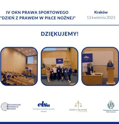 13 kwietnia odbyła się w Krakowie IV Ogólnopolska Konferencja Naukowa Prawa Sportowego „Dzień z Prawem w Piłce Nożnej”. W ramach podsumowania organizatorzy – stowarzyszenie studenckie ELSA Kraków – przedstawili kilka ważnych liczb: mieliśmy zaszczyt gościć 13 wybitnych ekspertów oraz 6 występujących studentów i doktorantów odnotowaliśmy 75 rejestracji uczestników biernych w szczytowym momencie na sali przebywało ponad 50 słuchaczy podczas Konferencji wymieniono niezliczenie wiele […]
