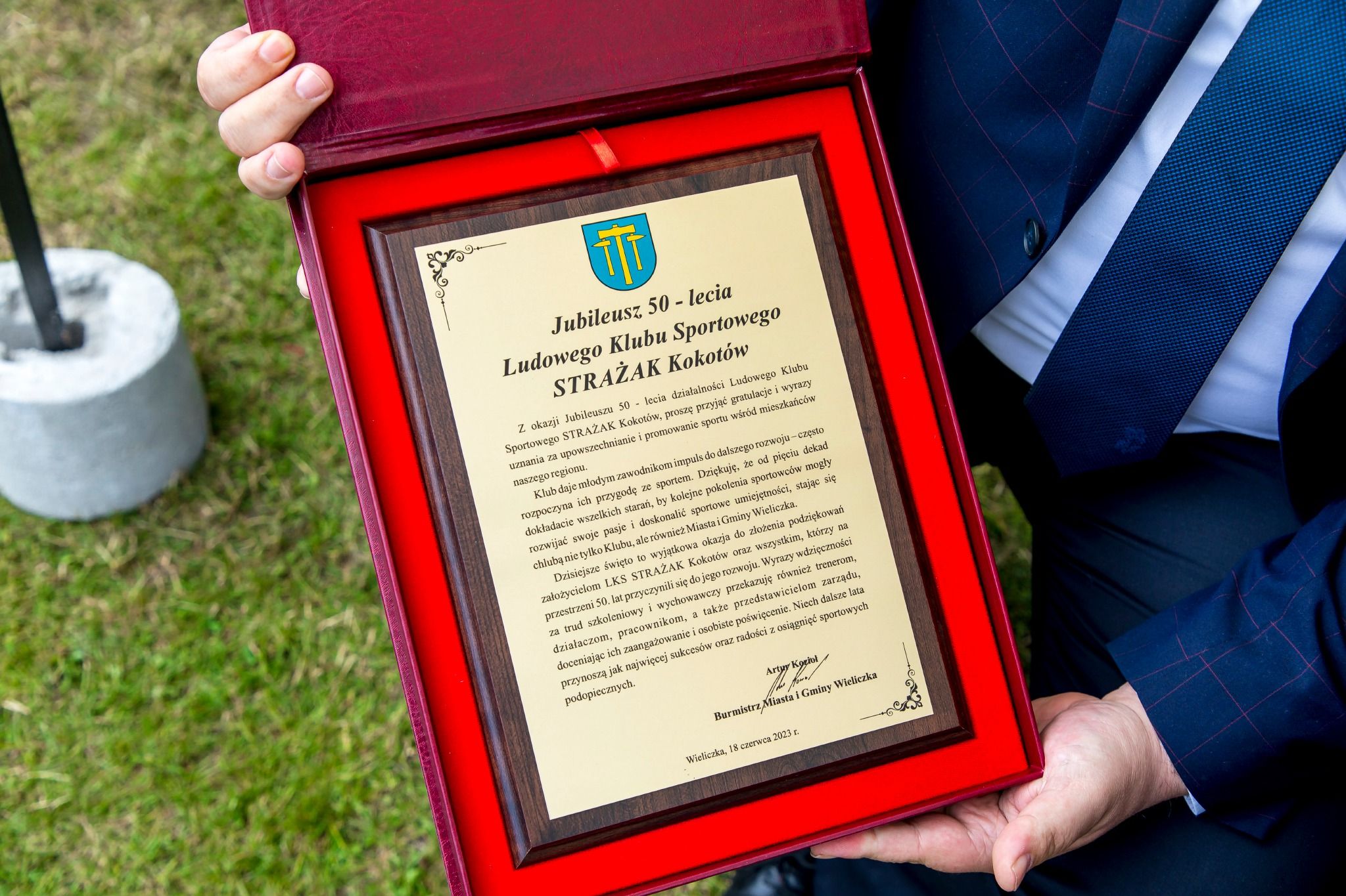 W imieniu burmistrza Wieliczki Artura Kozioła na ręce prezesa klubu, Jana Zawiły, jubileuszowy grawerton wręczył Piotr Krupa, zastępca burmistrza ds. inwestycji. Życzenia dalszych sukcesów w szkoleniu i wychowaniu kolejnych pokoleń młodych piłkarzy złożyła Angelika Waszkiewicz, dyrektor Wielickiego Ośrodka Sportu.