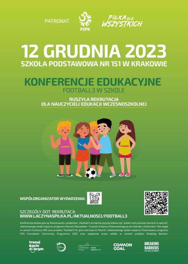 Po raz pierwszy w historii Polski Związek Piłki Nożnej obejmuje patronatem cykl konferencji edukacyjnych „football3 w szkole”, skierowanych do nauczycieli edukacji wczesnoszkolnej, organizowanych przez Stowarzyszenie Trenuj Bycie Dobrym. Szóste z zaplanowanych spotkań odbędzie się 12.12.2023 r. w godz. 11:00-13:30 w Szkole Podstawowej nr 151 z Oddziałami Integracyjnymi im. Uniwersytetu Jagiellońskiego w Krakowie (ul. Wacława Lipińskiego 2).