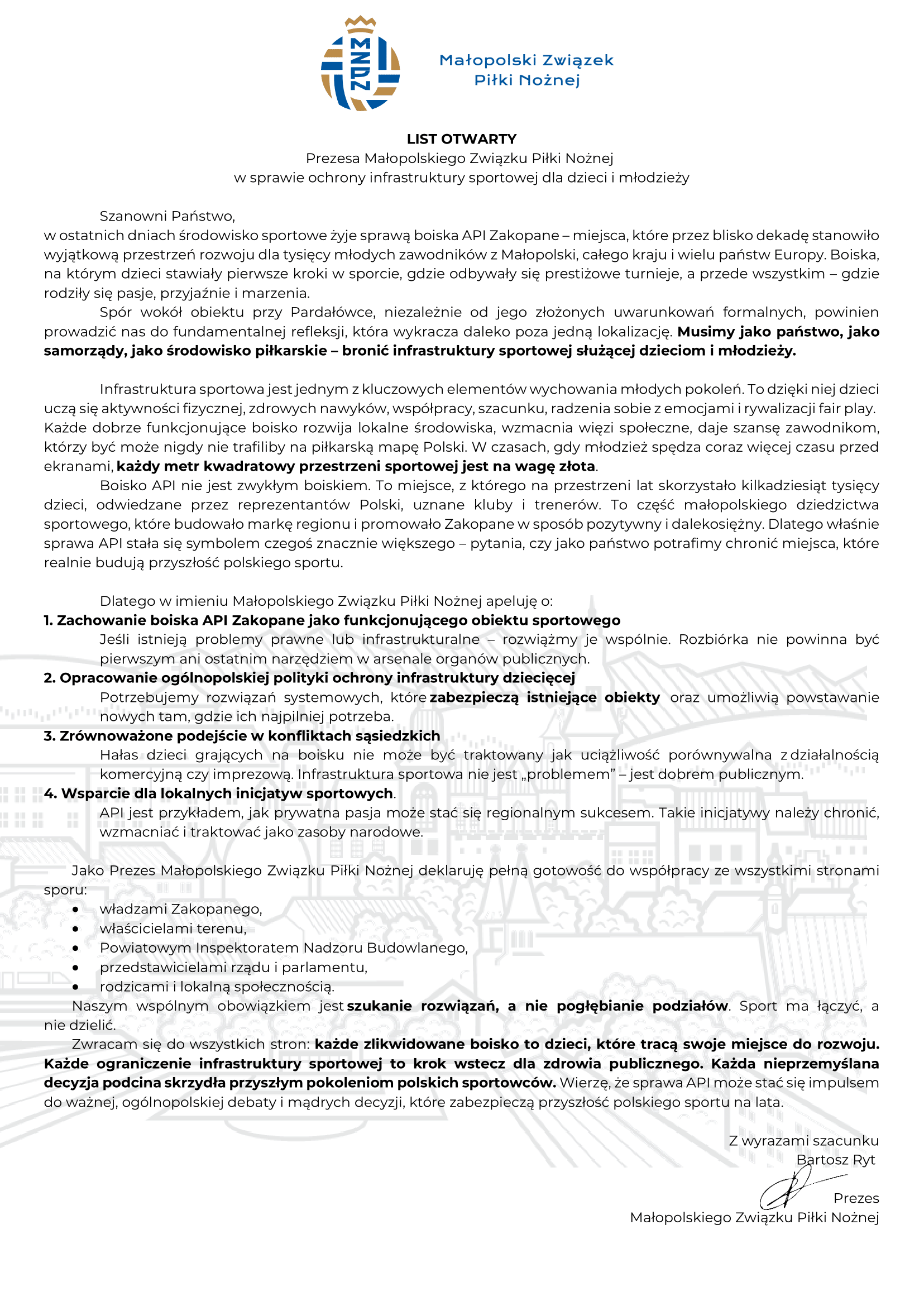 Ostatnie wydarzenia związane z rozbiórką boiska API w Zakopanem odbiły się szerokim echem w środowisku sportowym całej Polski. Bartosz Ryt, prezes Małopolskiego Związku Piłki Nożnej, wystosował list otwarty z apelem do stron sporu, władz samorządowych i centralnych oraz opinii publicznej o podjęcie zdecydowanych działań na rzecz ochrony obiektów kluczowych dla rozwoju sportowego najmłodszych i zachowanie boiska API jako funkcjonującego obiektu sportowego.