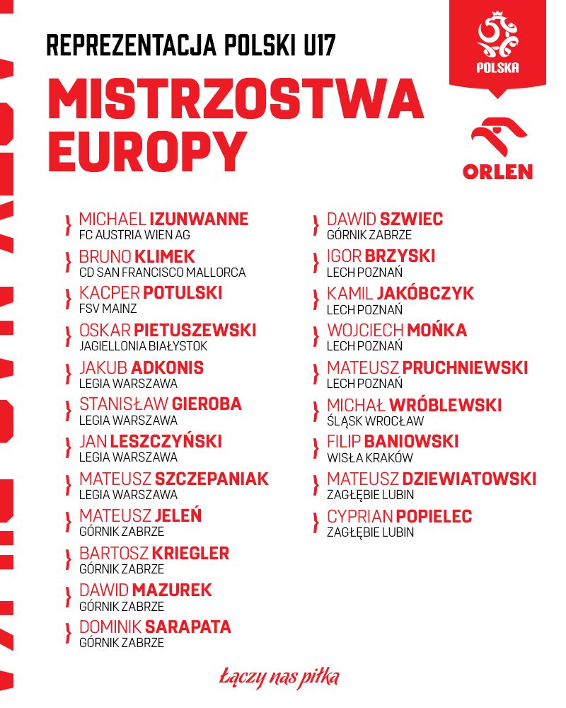 Selekcjoner Rafał Lasocki ogłosił listę 21 piłkarzy powołanych do reprezentacji Polski na turniej finałowy mistrzostw Europy do lat 17, który w dniach 20 maja – 5 czerwca odbędzie się na Cyprze.