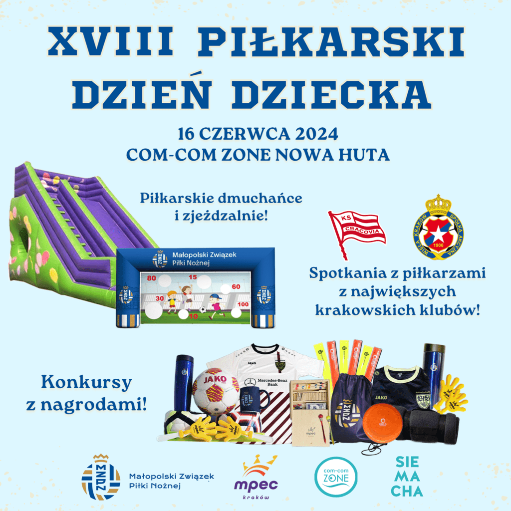 Już w najbliższą niedzielę, 16 czerwca, zapraszamy futbolowe drużyny dzieciaków na doroczny Piłkarski Dzień Dziecka. Tegoroczne zawody w kategoriach wiekowych r. 2015, 2016, 2017 i 2018 odbędą się w godzinach 9-13 na obiektach Com-Com Zone w Krakowie – Nowa Huta, przy ul. Ptaszyckiego 6.