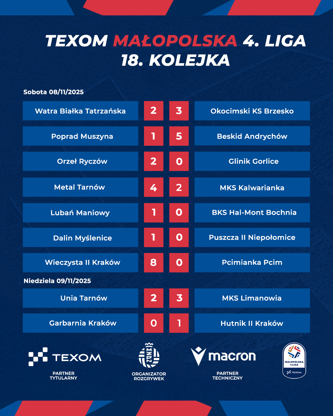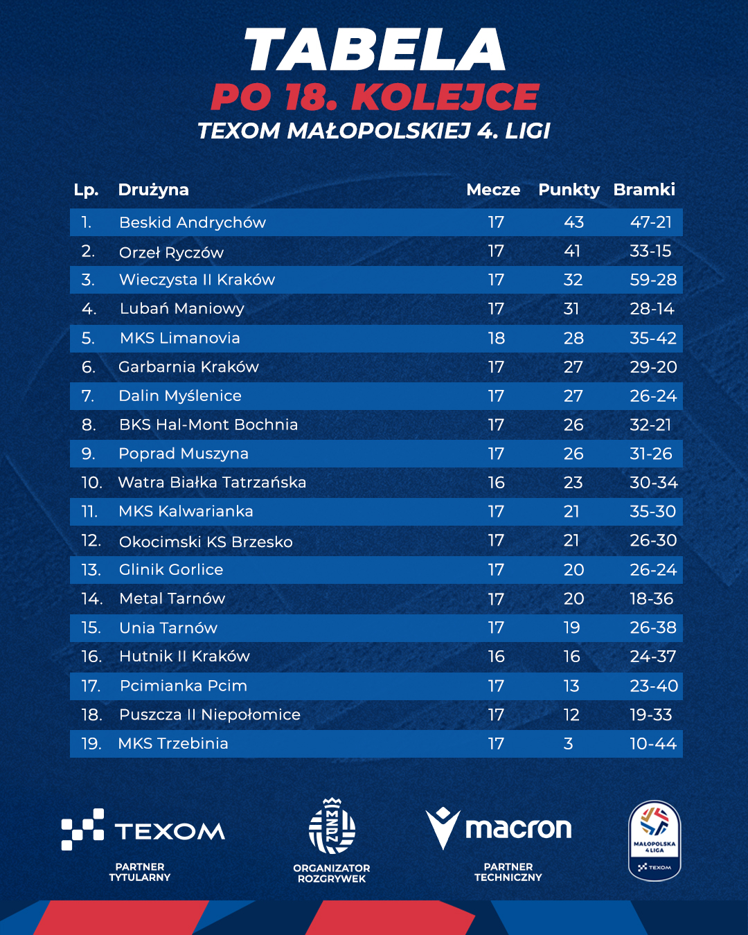 Za nami 18. kolejka rozgrywek TEXOM Małopolskiej 4. Ligi! Sprawdźmy, co działo się przez ostatni weekend.