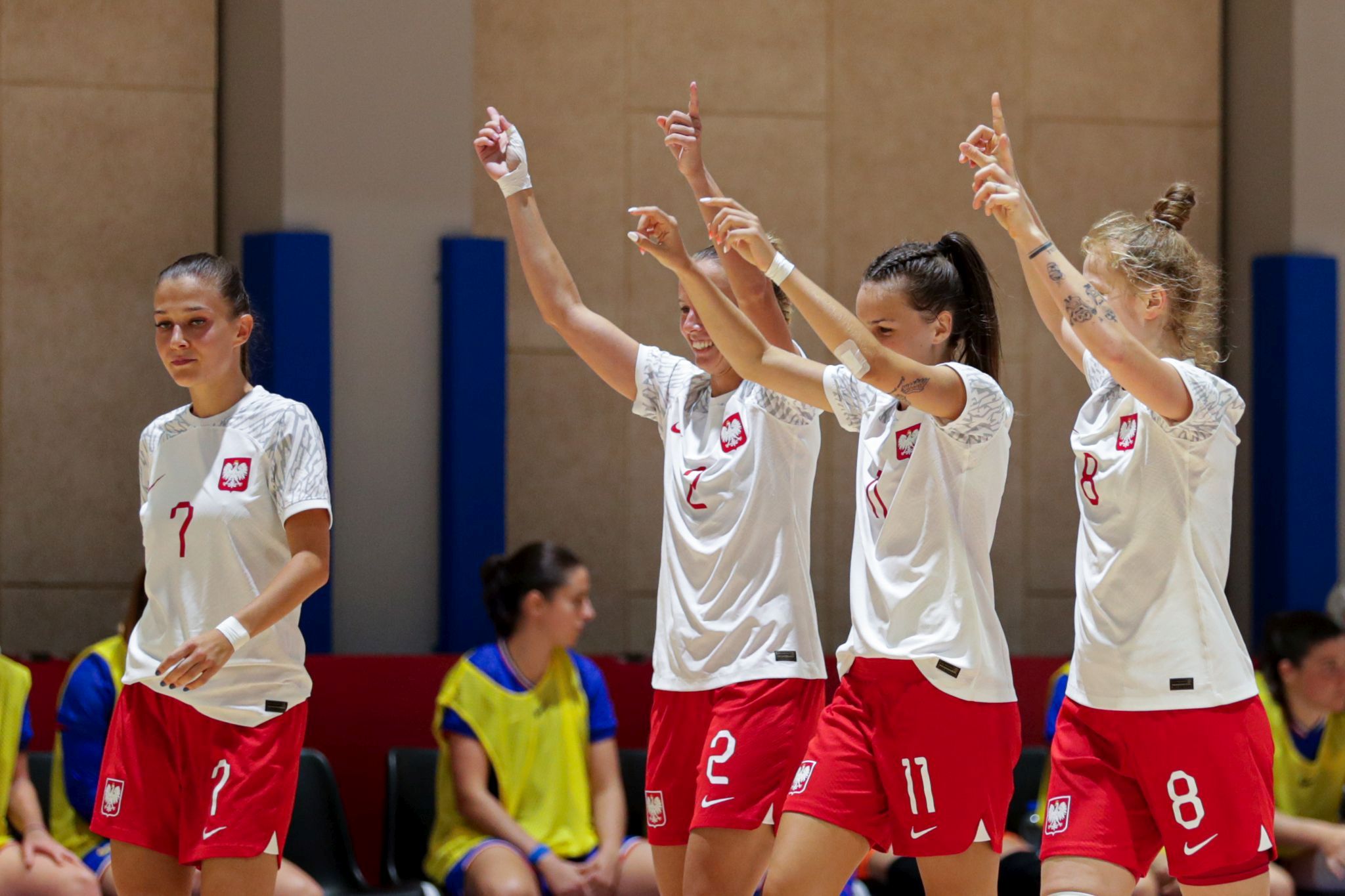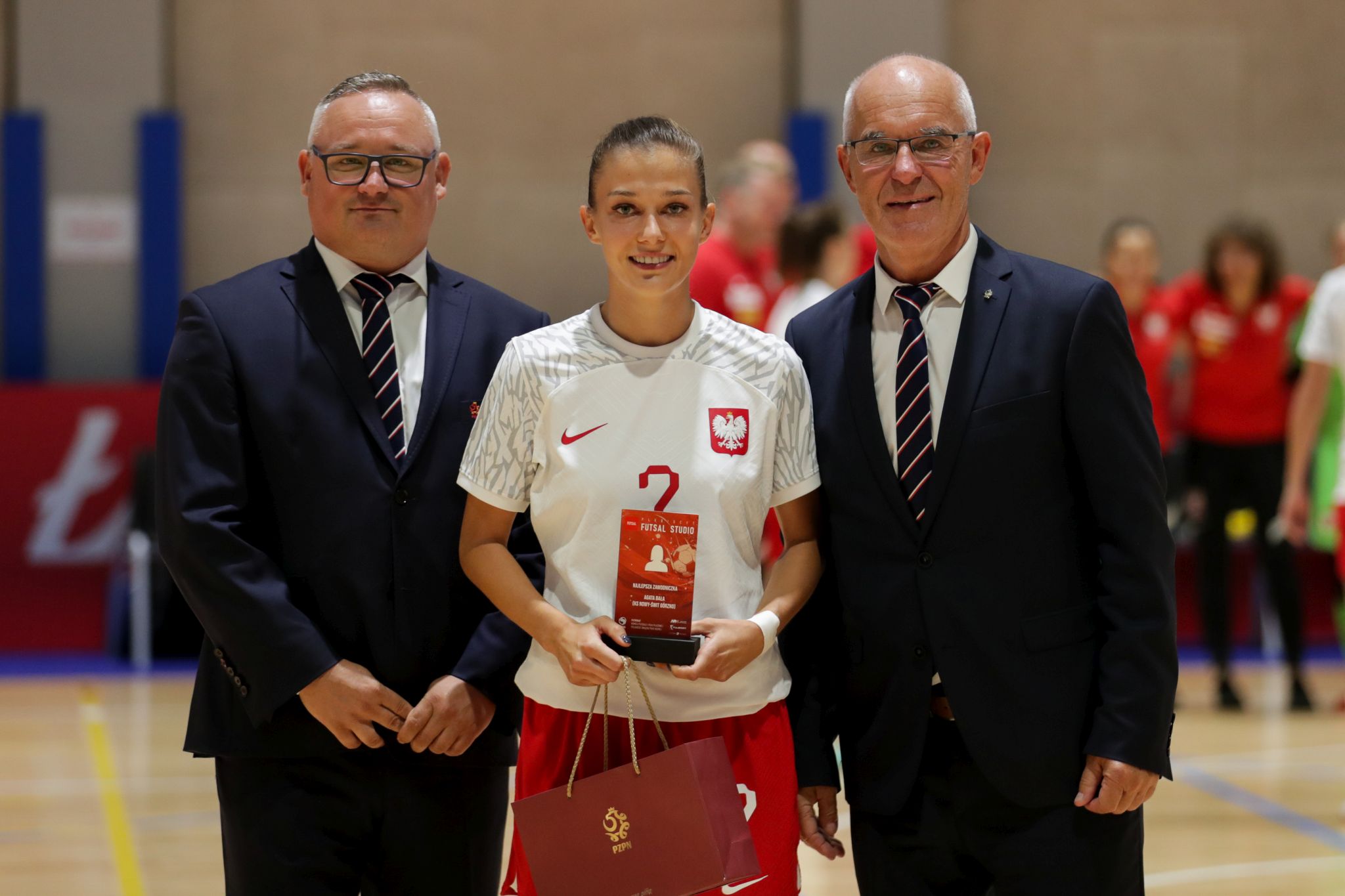 Przed meczem przewodniczący Komisji Futsalu Polskiego Związku Piłki Nożnej Grzegorz Morkis i przewodniczący Komisji Futsalu Małopolskiego ZPN Piotr Zawodny wręczyli kadrowiczce Agacie Bale nagrodę za zdobycie tytułu MVP poprzedniego sezonu Futsal Ekstraligi. (PAN)