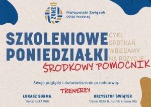 Zapraszamy na trzecie spotkanie w ramach projektu SZKOLENIOWE PONIEDZIAŁKI, organizowane przez Wydział Szkolenia Małopolskiego Związku Piłki Nożnej. Odbędzie się ono 22 kwietnia, w cyklu „Wbiegamy na pozycję” tym razem ŚRODKOWY POMOCNIK. Swoje poglądy i doświadczenie przedstawią: Łukasz SURMA – trener UEFA PROKrzysztof ŚWIĄTEK – trener UEFA B, Hutnik Kraków U16 Termin: 22.04.2024, godz. 18-21Miejsce: sala konferencyjna Specjalistycznej Poradni Wczesnej Pomocy Psychologiczno Pedagogicznej […]