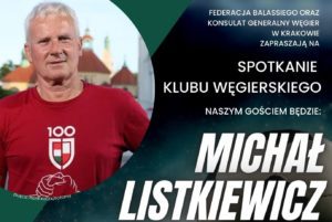 Federacja Balassiego i Konsulat Generalny Węgier w Krakowie zapraszają na SPOTKANIE KLUBU WĘGIERSKIEGO. Gościem będzie Michał Listkiewicz, międzynarodowy sędzia pilkarski, były prezes PZPN, hungarysta. Spotkanie odbędzie się w środę 10 maja, o godz. 18, w Konsulacie Generalnym Węgier w Krakowie, ul. Lubicz 17H. Wstęp wolny. Na spotkaniu będzie możliwość zakupu ksiązki LISTEK i zdobycia autografu Michała Listkiewicza.