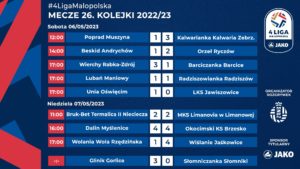 Po piłkarskiej środzie czas na piłkarski weekend. Dziś i jutro mecze 26. kolejki JAKO 4 LIGI MAŁOPOLSKIEJ. Lider – Wiślanie Jaśkowice – gra jutro w Woli Rzędzińskiej, a wicelider – rezerwa „Słoni” – też jutro, u siebie, z Limanovią. Na żywo na kanale YouTube MZPN w ten weekend pokażemy mecz Dalinu z Okocimskim. JAKO 4. LIGA MAŁOPOLSKA, 26. kolejkaSobota, 6 maja 202312:00 Poprad Muszyna – Kalwarianka […]