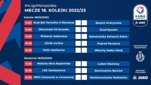 Rozpoczęła się runda wiosenna w JAKO 4. LIDZE MAŁOPOLSKIEJ. Liderujący Wiślanie Jaśkowice pokonali Kalwariankę 2-0 i utrzymali 9-punktową przewagę nad rezerwą Bruk-Betu Termaliki Nieciecza. 18.kolejka JAKO 4 LIGI MAŁOPOLSKIEJSobota, 18 marca 2023Bruk-Bet Termalica II Nieciecza – Beskid Andrychów 5-0Okocimski KS Brzesko – Orzeł Ryczów 0-3Wiślanie Jaśkowice – Kalwarianka Kalwaria Zebrzydowska 2-0Glinik Gorlice – Poprad Muszyna 1-1Dalin Myślenice – Wierchy […]