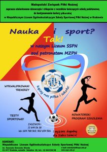 Małopolski Związek Piłki Nożnej zaprasza utalentowane dziewczęta i chłopców z roczników kończących szkołę podstawową do kontynuowania kariery piłkarskiej w Niepublicznym Liceum Ogólnokształcącym Szkoły Sportowej Piłki Nożnej im. Generała Bernarda Monda w Krakowie. Szczegóły w poniższym załączniku.